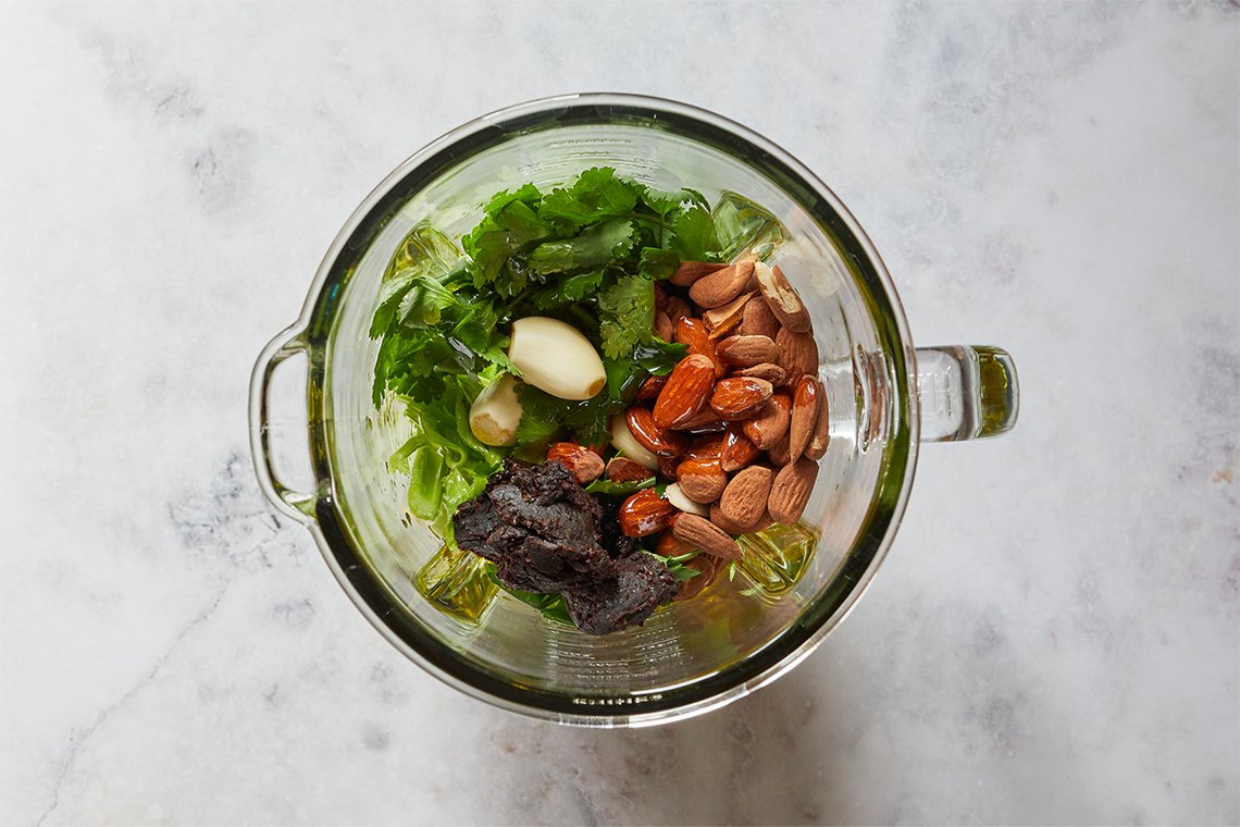 Coloque todos os ingredientes no copo de um liquidificador e bata até obter um creme com alguma textura.