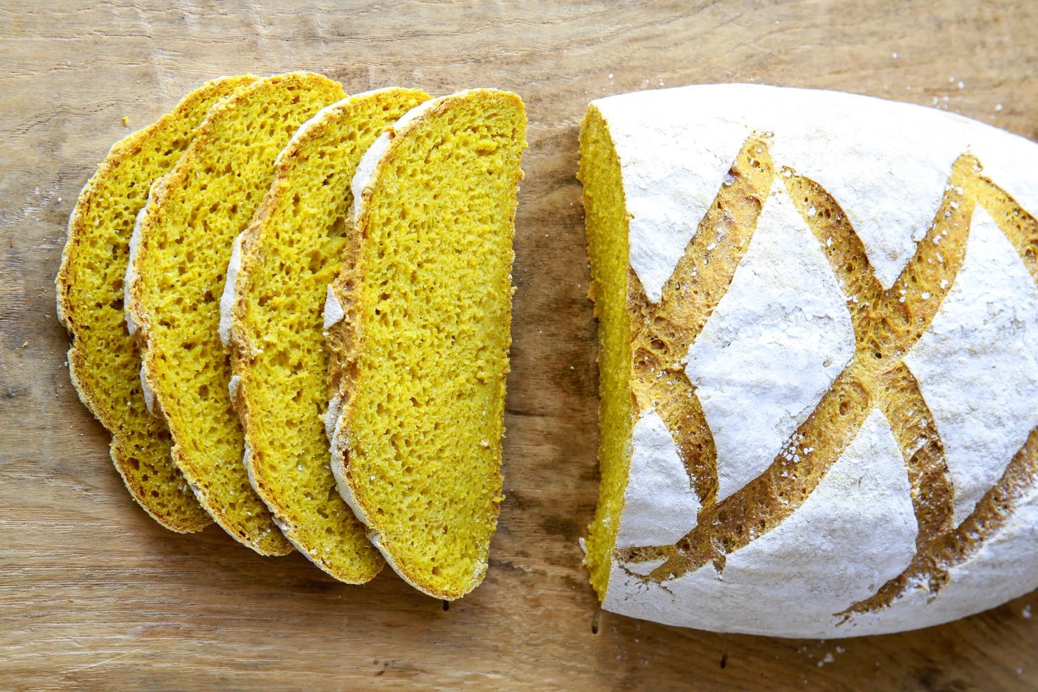 Além da cor amarela, forte e bonita, que fica bem em qualquer tábua ou cesto de pão, esta receita de pão tem também propriedades anti-inflamatórias. A combinação da curcuma com a pimenta-preta é muito poderosa, pois a pimenta aumenta a biodisponibilidade da curcuma, permitindo que o nosso corpo beneficie em pleno do seu poder anti-inflamatório.