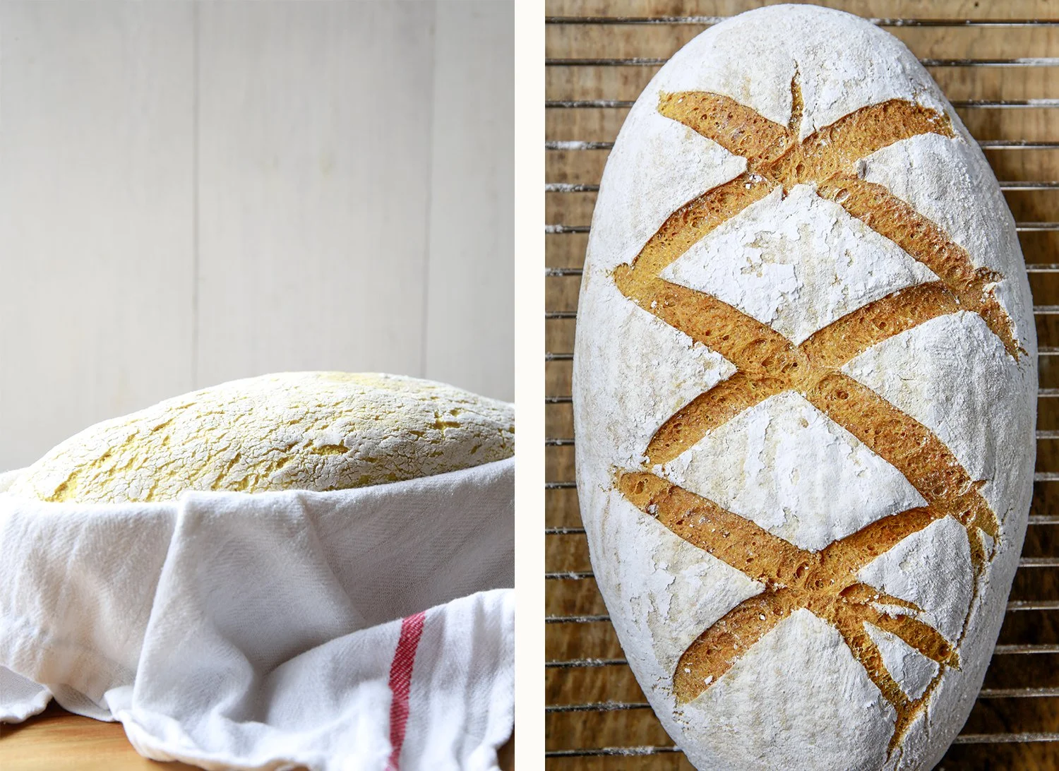 Retire o pão para um tabuleiro de forno forrado com papel vegetal, polvilhe bem com o polvilho e dê-lhe uns cortes para que abra no forno.