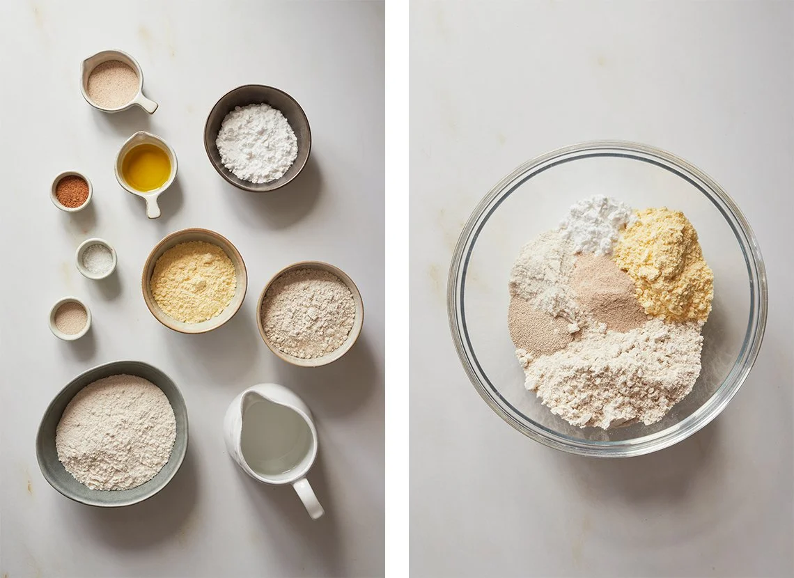 Misture as farinhas para polvilhar e reserve. Entretanto, prepare também o molho de tomate.