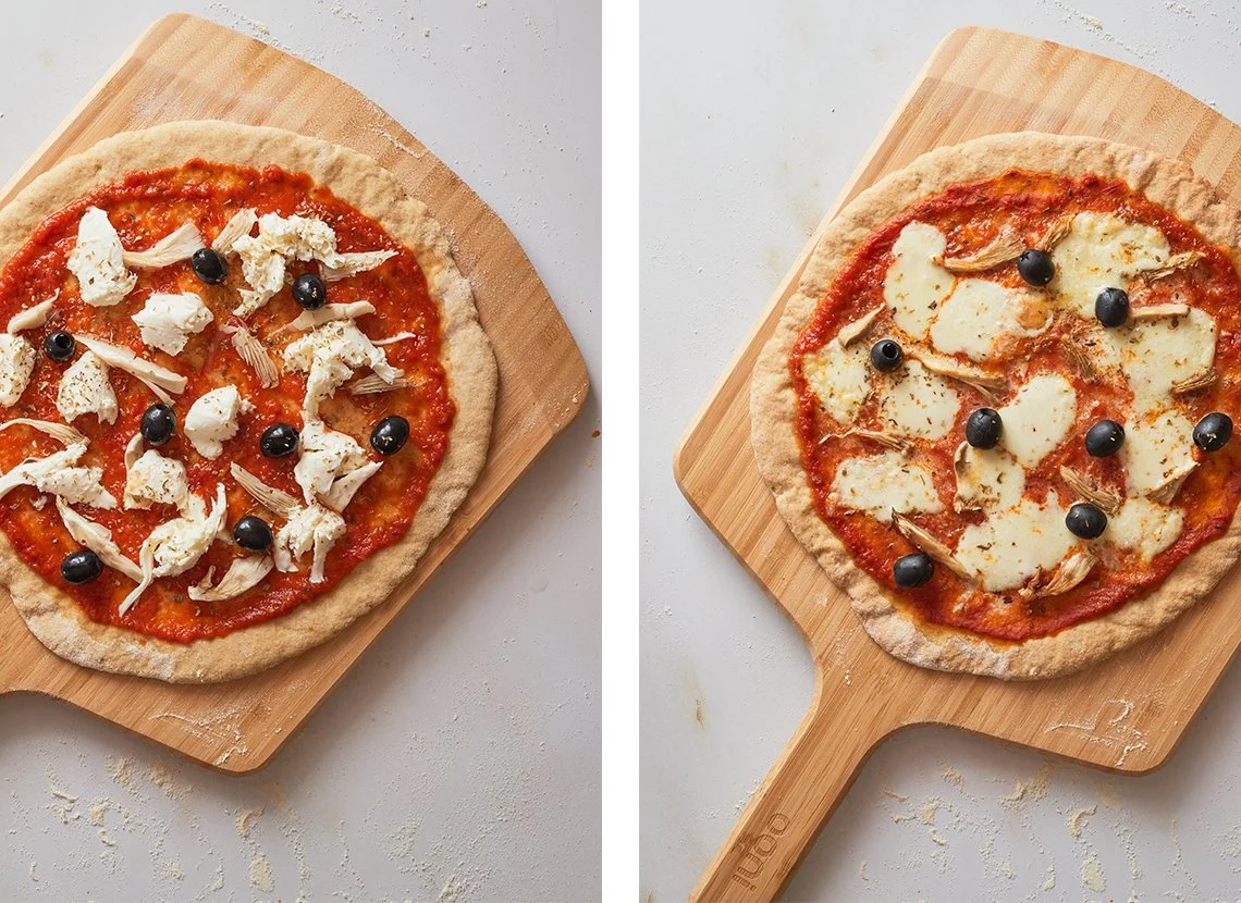 ** Pode congelar a base da pizza nesta fase para usar mais tarde. Depois, basta rechear a base da pizza, ainda congelada, e seguir com a receita