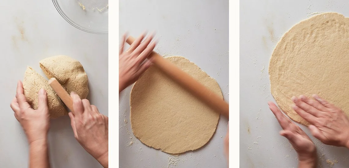 Divida a massa em 2 ou 4 partes iguais. Faça uma bola com cada uma delas, amasse novamente e estenda-a com a ajuda de um rolo de massa. Pressione o centro com as mãos de forma a que fique ainda mais fina. Vá polvilhando com a mistura de farinhas mas não use muita! Apenas o necessário para não colar.