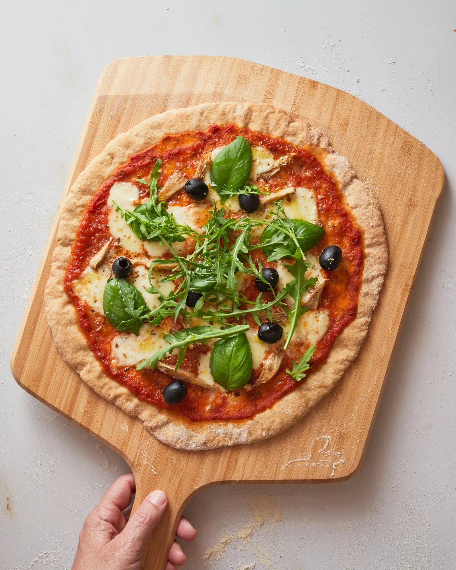 * Ou 50 g de massa mãe (para 2 pizzas médias). No caso de substituir por massa mãe, adicione a massa aos líquidos, no ponto 2 e deixe a levedar à temperatura ambiente entre 3 a 6 horas.